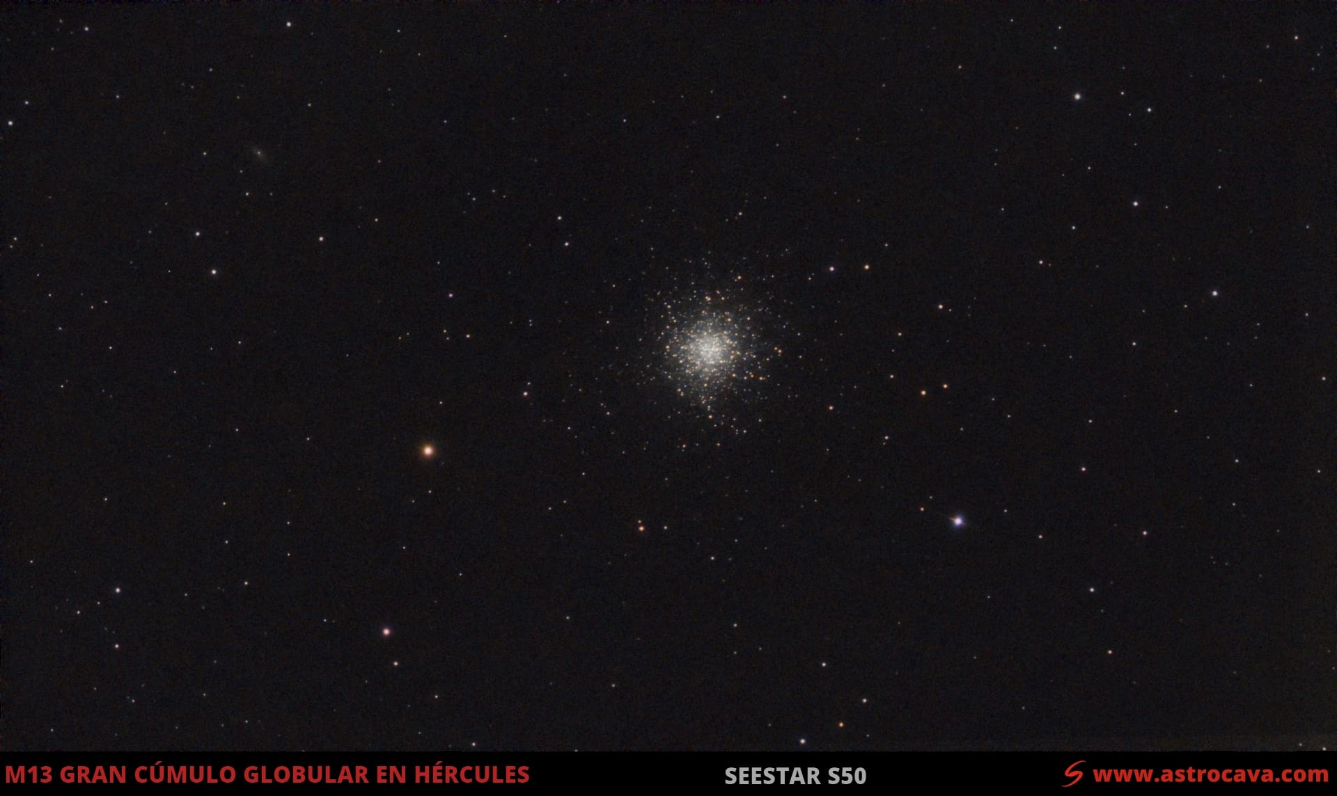 Primera prueba con el Seestar S50 aprovechando que M13 se sitúa en verano muy cerca del cenit para no tener que usar el filtro contra la contaminación lumínica que lleva el telescopio. Un cúmulo globular espectacular del Catálogo Messier.