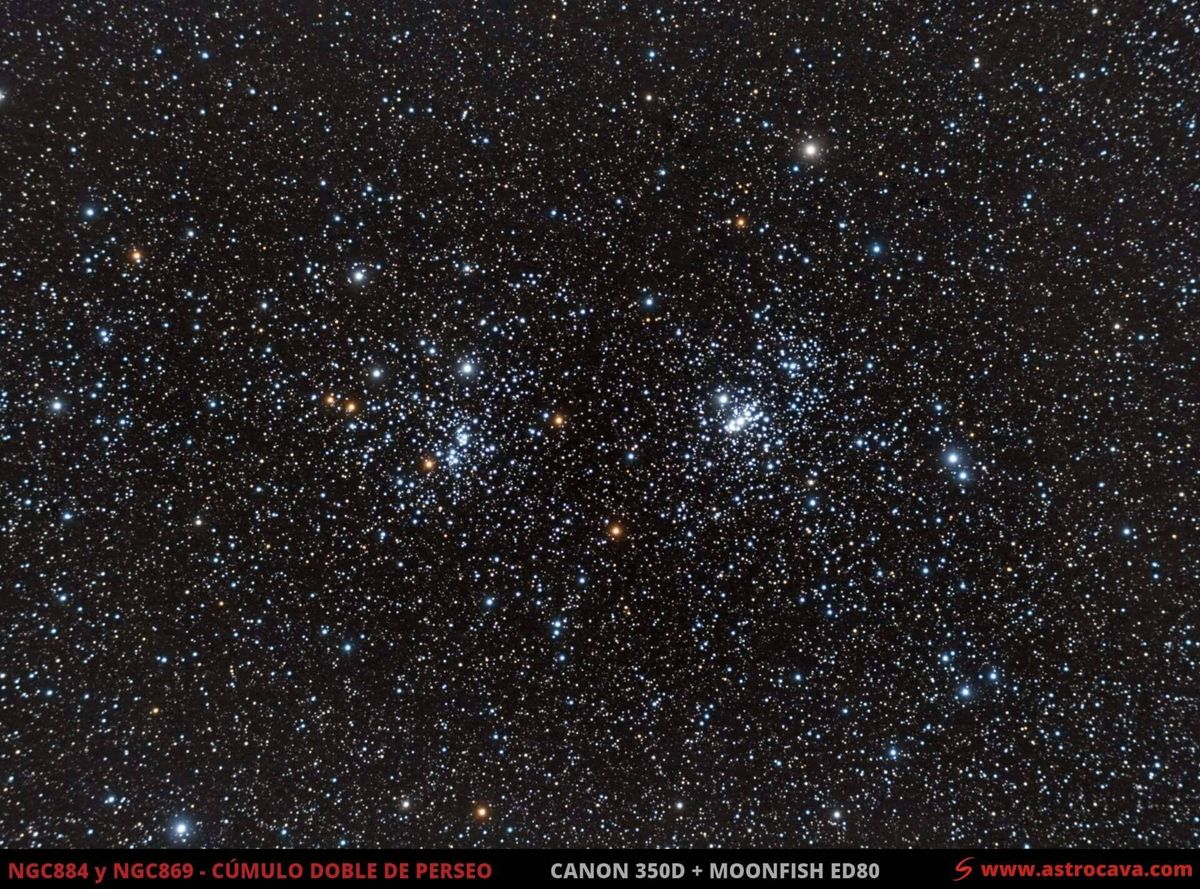 - Cúmulo abierto «Doble de Perseo» (NGC869-884). Dos cúmulos abiertos que merece la pena poner juntos en el mismo campo. Abundancia de estrellas anaranjadas que contrastan con el resto de estrellas de los cúmulos. Buen objetivo para prismáticos también.